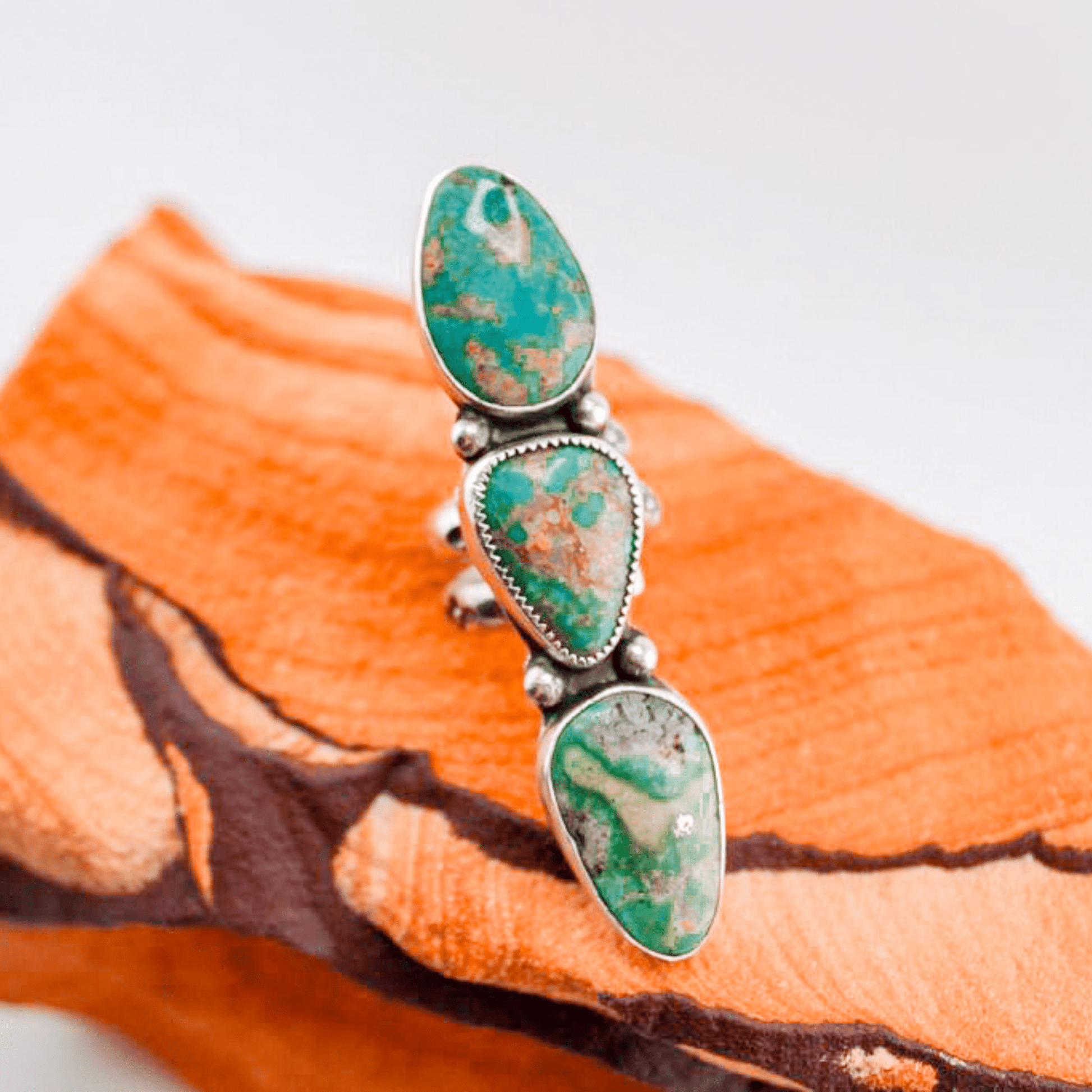 The Range Turquoise Ring is a showstopper with three vibrant stones set on a triple-wrapped, hand-stamped Zia Cross shank. This stunning piece brings a playful pop of color and a touch of bold style—perfect for making a confident statement that’s all your own.