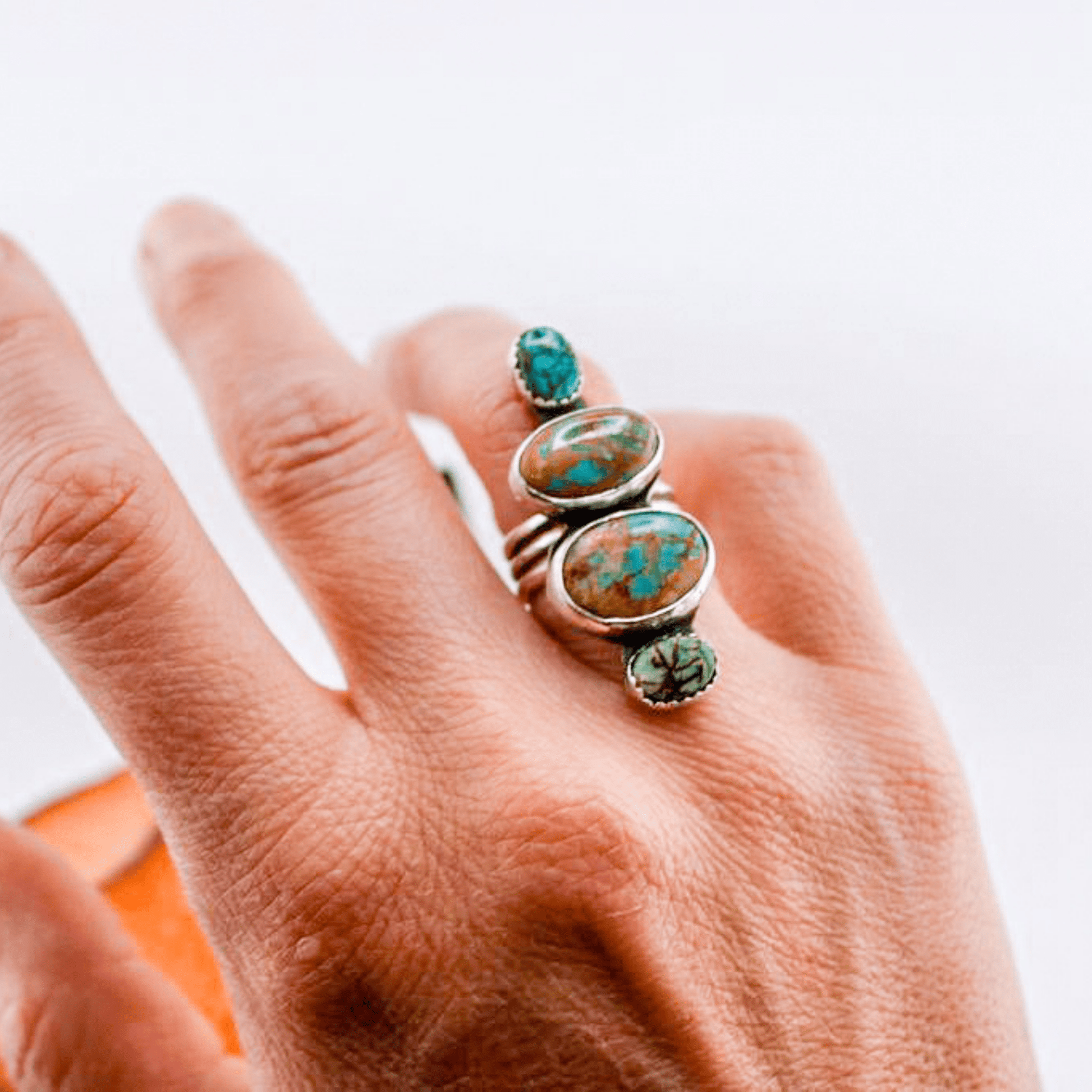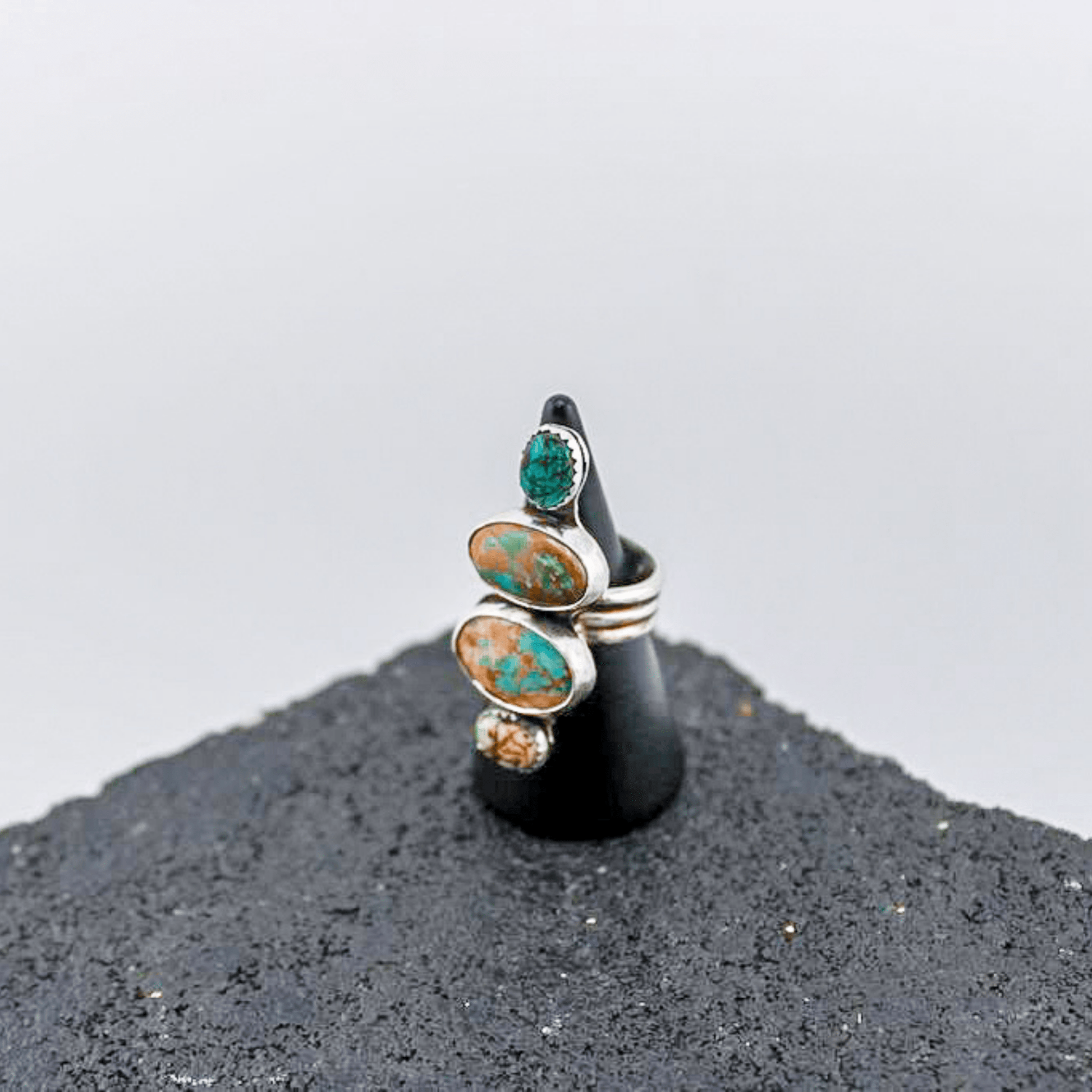 The Sandrock Sky ring showcases an expert blend of natural Sonoran turquoise and opal stones, artfully stacked to create a distinctive and layered design. Featuring two Sonoran turquoise stones paired with two opals, this ring offers a unique harmony of vibrant colors and textures. Perfect for those who appreciate expertly crafted jewelry with a refined, nature-inspired aesthetic.